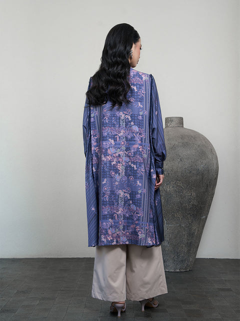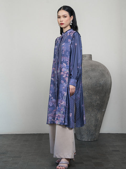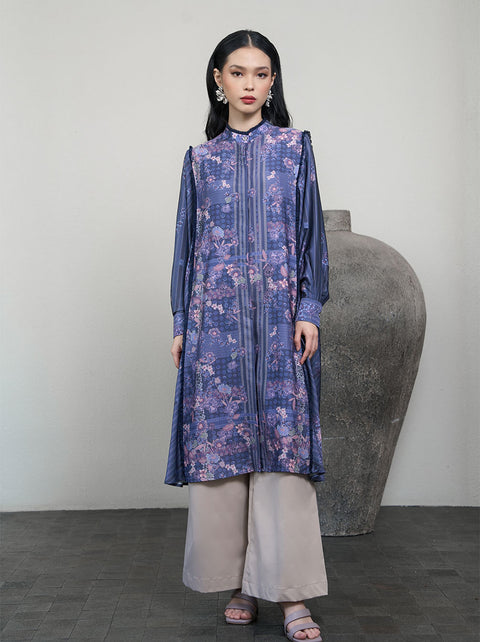 Haniya tunik yang memukau menggabungkan berbagai motif dengan floral print khas koleksi Athemina. Potongan longgarnya memberi kenyamanan, dengan aksen kerutan yang memberi kontras.