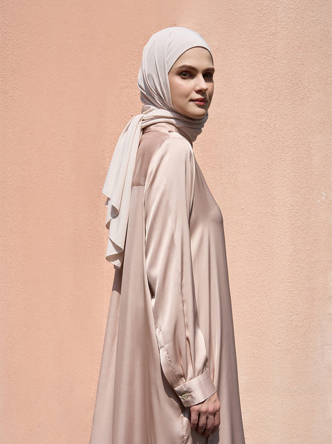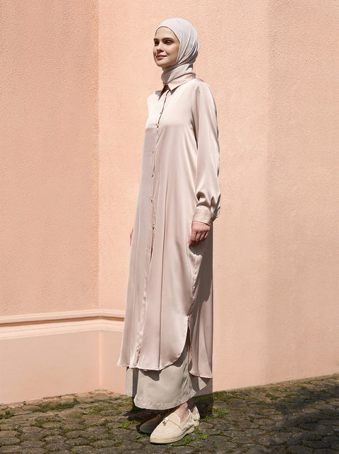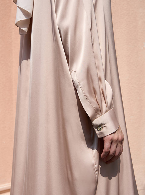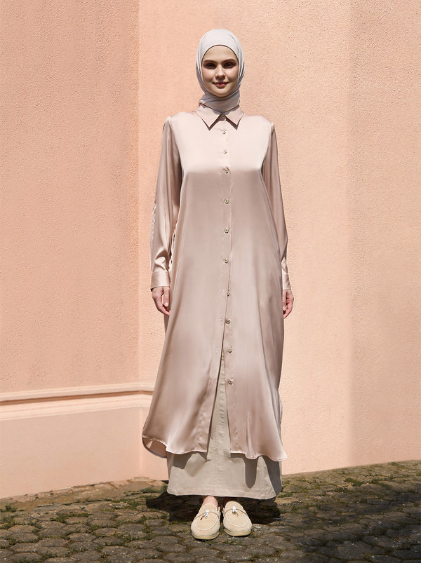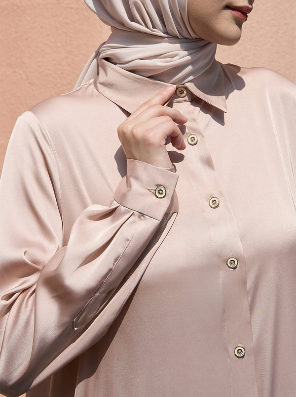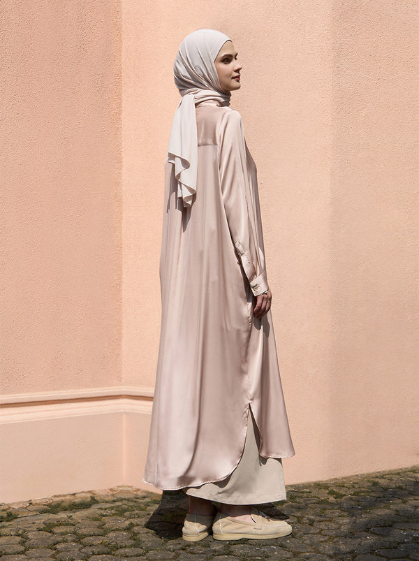 A modern take on traditional abaya, featuring Kami embossed buttons and collar. Clean and highly functional, with side pockets and a touch of sheen from airy satin material. Alternatif abaya dengan desain shirt dress modern berbahan satin yang cantik. Desainnya yang simple dilengkapi dengan saku sisi dan kancong emboss Kami. - Available in 1 color (Soft Pink) - Opening with button on the front - Made with sateen polyester material - Wash with like colors in cold water - Gentle hand wash using mild detergent is recommended - Iron with medium setting to prevent burn or melt of fabric - Tersedia dalam 1 warna (Soft Pink) - Dibuka dengan kancing pada bagian depan - Dibuat menggunakan bahan satin polyester - Cuci dengan warna senada menggunakan air dingin - Cuci lembut dengan tangan menggunakan deterjen ringan direkomendasikan - Setrika dengan setelan sedang untuk mencegah kain hangus atau meleleh - Model's height: 176 cm - Model's bust: 75 cm - Model's waist: 59 cm - Model's hips: 89 cm - Model is wearing medium size