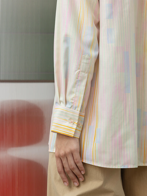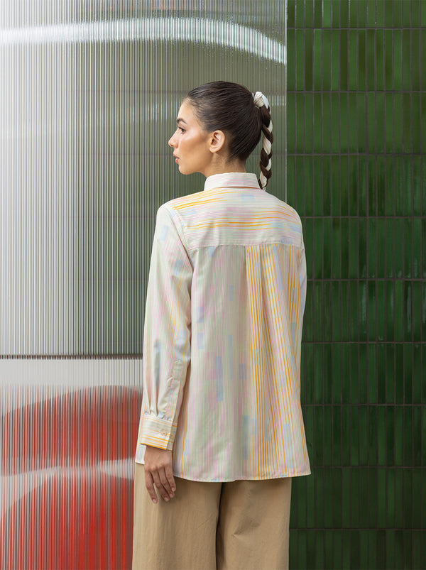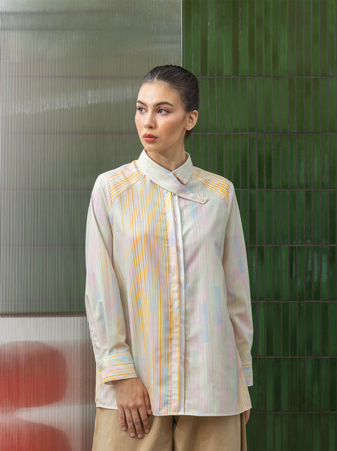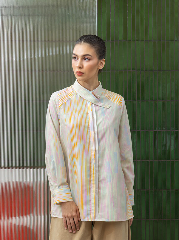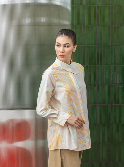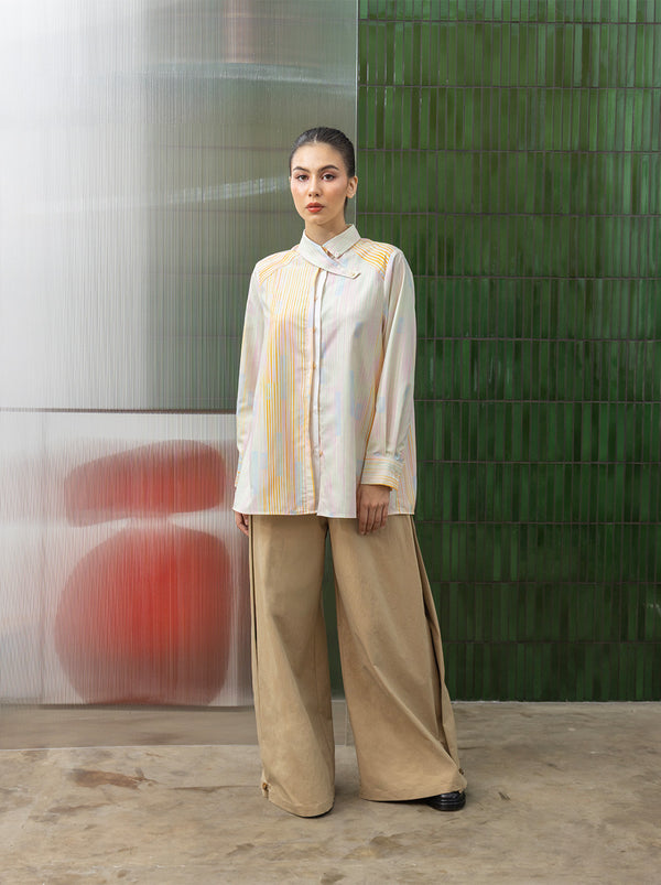 Luma top membawa pesan koleksi Katla: Linear: hidup yang terus berlanjut dengan segala rintangannya. Hadir dengan dua fit manset dan model kerah yang unik.