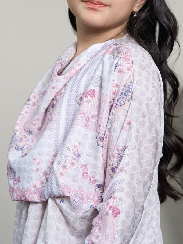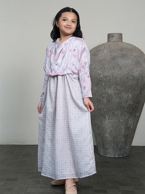 An adorable Raya dress for little girls with Athemina signature florals. Adorned with drapping collar and elastic bustline.