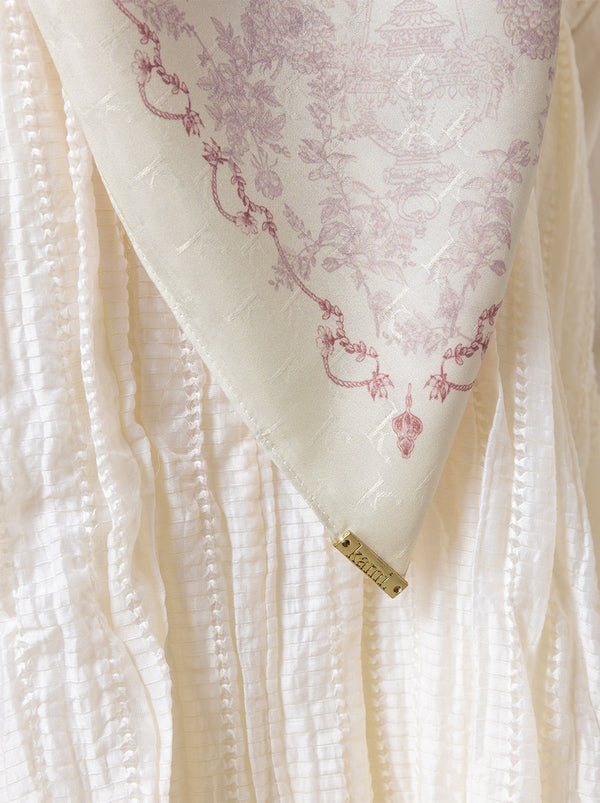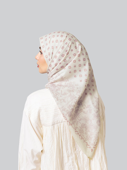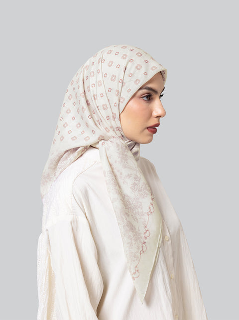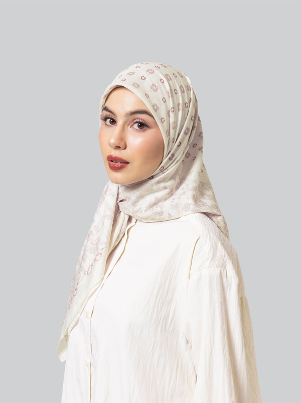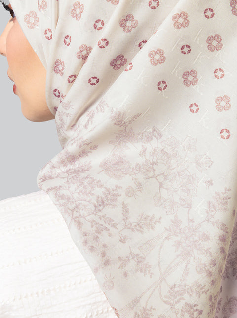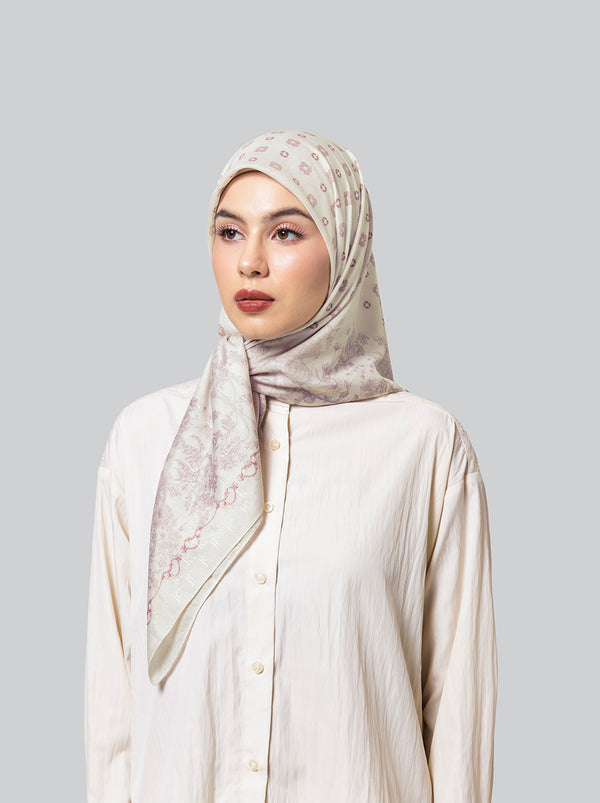 Scarf bagi penyuka gaya simple, Nola Scarf hadir dengan warna-warna netral, monogram dan motif floral kecil dalam bahan jacquard Kami.