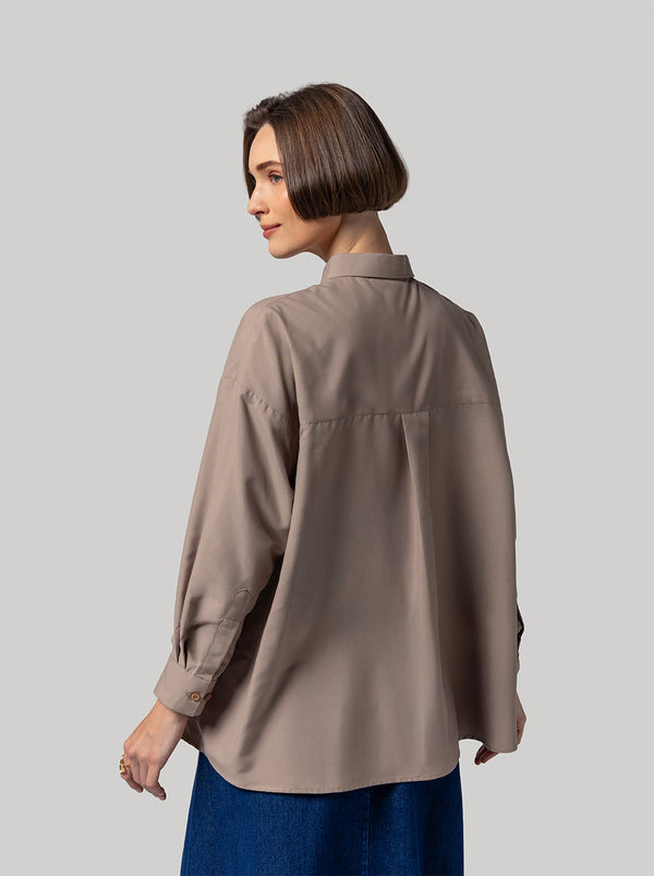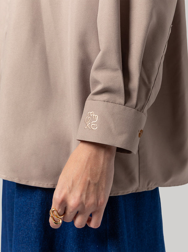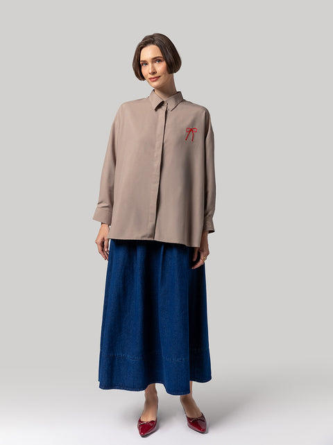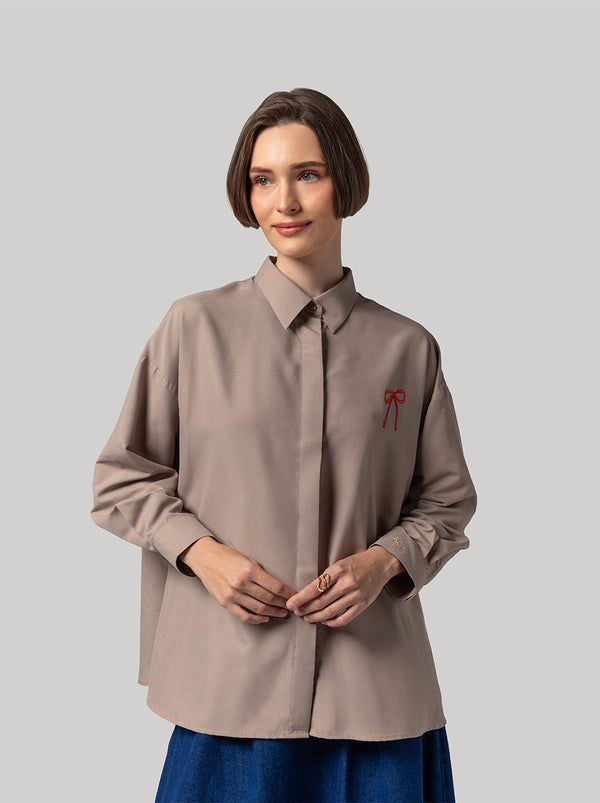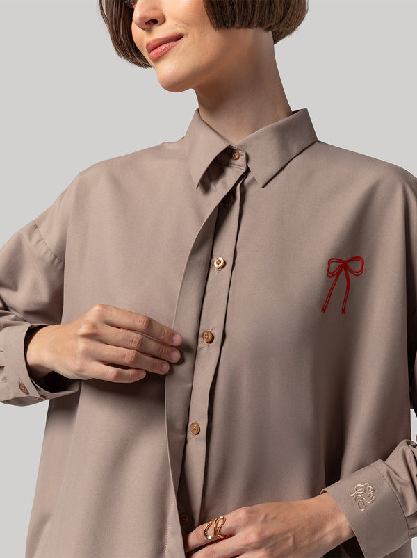 Classic shirt meets candied colors on Nue Top. Featuring velvety smooth material, Kami monocurve and bow embroideries.