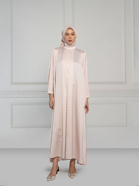 Tampil elegan di momen Raya dengan Rania dress. Model A line dengan bahan satin jacquard, dilengkapi dengan lengan lebar dan bukaan kancing belakang.