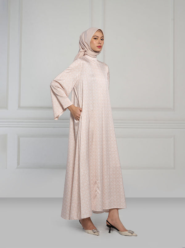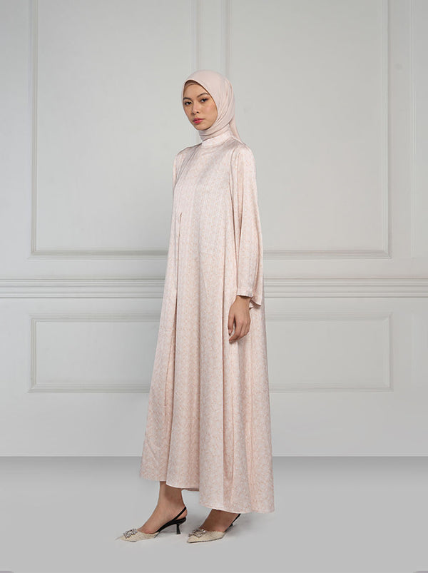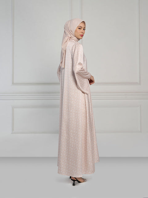 Stuns in Raya with the elegant Rania dress. The A line cutting stuns in the beautiful satin jacquard, with wide sleeves and back buttons.