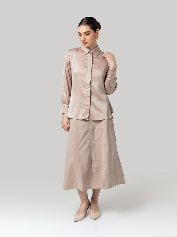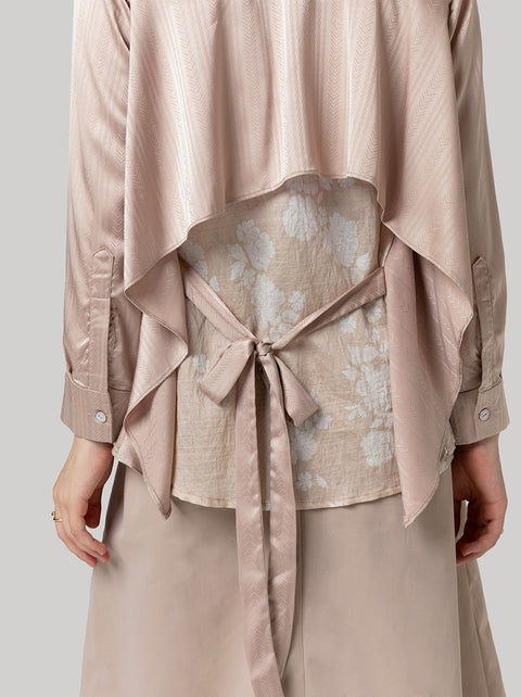 Umayra top menampilkan kombinasi bahan jacquard yang ringan, dengan model kemeja klasik di depan, dan model layering bertali di belakang.