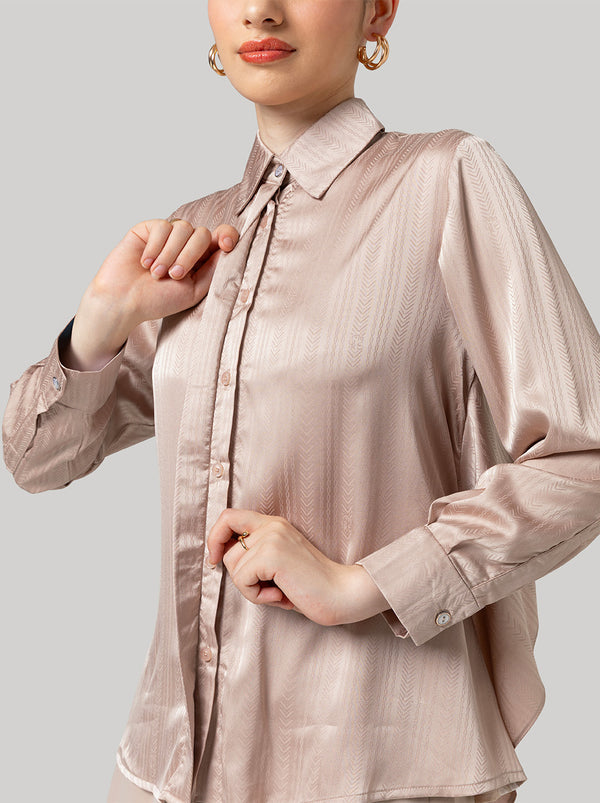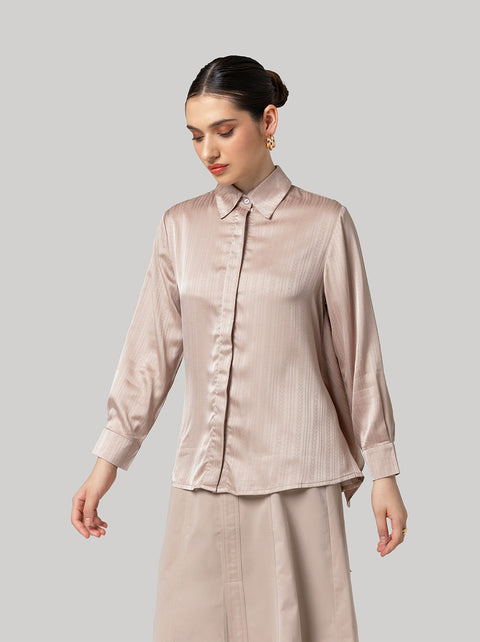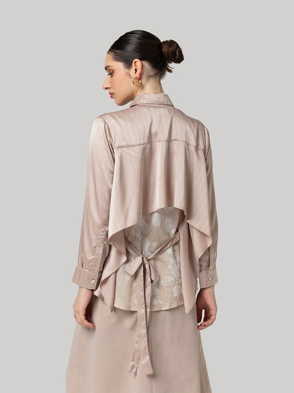 Umayra top shows mixed flowy jacquard, with classic button up shirt design at the front, and layering twist at the back. Adjustable fit with a string inside.