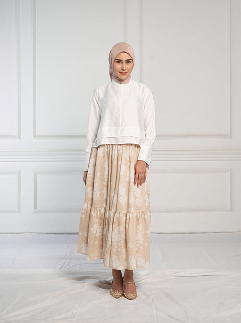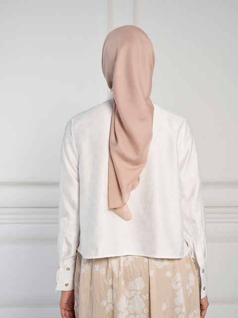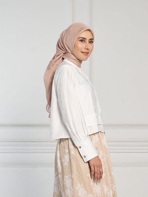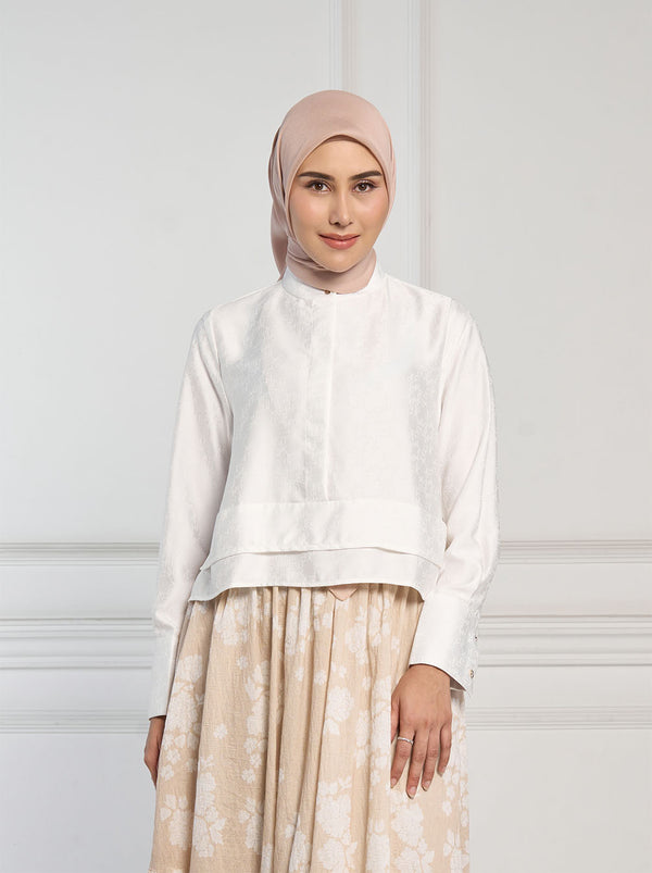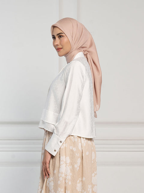 Lengkapi gaya smart casual dengan Vian Top. dalam bahan jacquard warna netral, dan kancing tersembunyi, memberi kesan rapi dalam seketika.