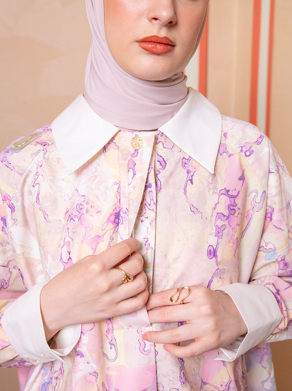 Kreatif dan manis, Vivin top hadir dengan motif bunga bak lukisan. Detail kancing emas Kami dan detail renda memberi sentuhan feminin pada modelnya yang boxy.