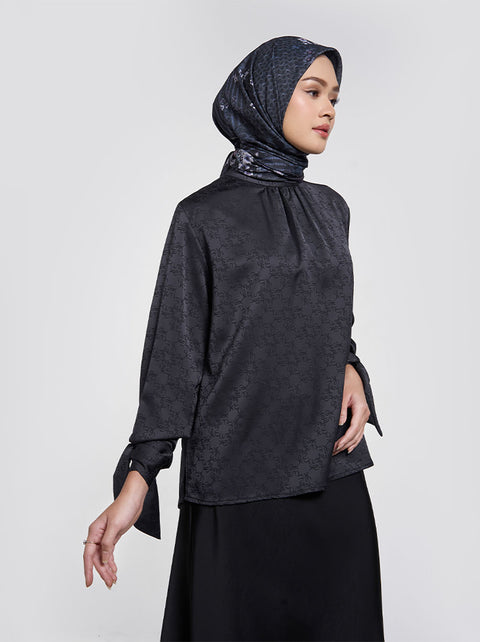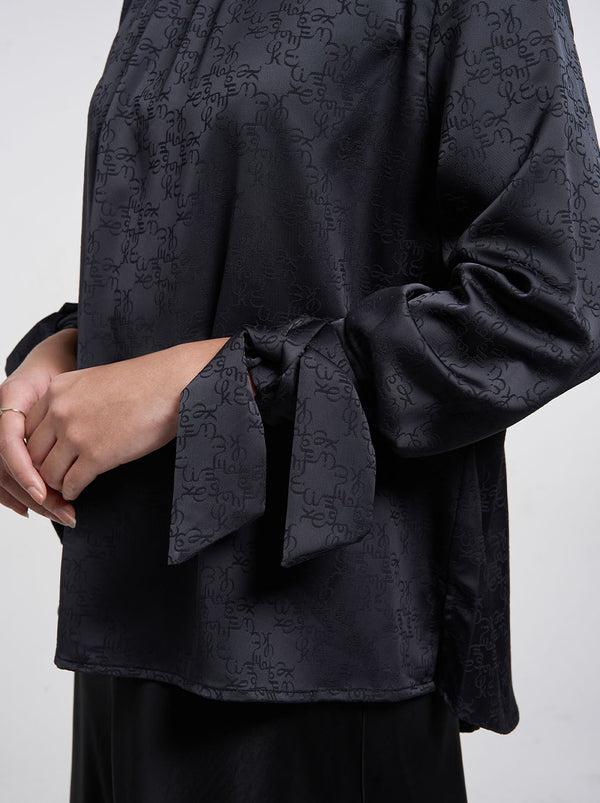 A neutral loose top with luxurious satin finish. The gathered neckline and bowed cuff add further depth to the jacquard creation.