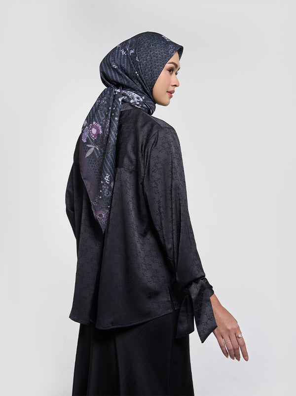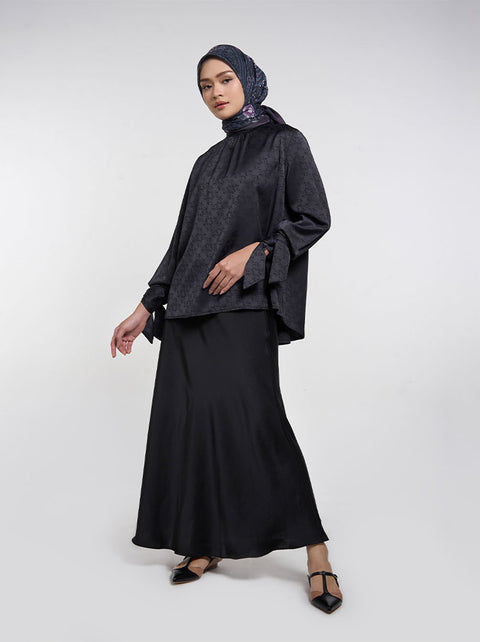 Atasan longgar dalam warna netral dan bahan satin yang mewah. Detail kerah dan manset berpita menambah dimensi pada kreasi jacquard Kami. Mono Curve.