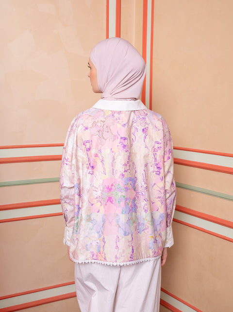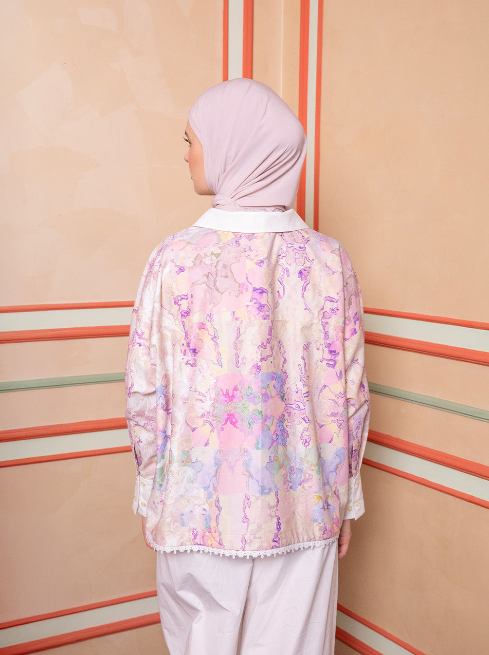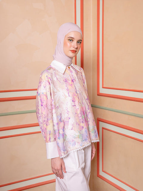 Kreatif dan manis, Vivin top hadir dengan motif bunga bak lukisan. Detail kancing emas Kami dan detail renda memberi sentuhan feminin pada modelnya yang boxy.