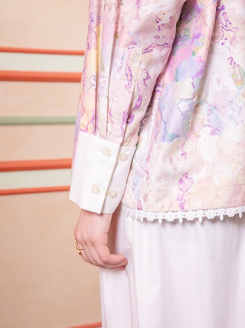 Artsy and charming, Vivin top features a full on watercolor floral. The boxy cut is adorned with Kami golden button and adorable lace detailing.