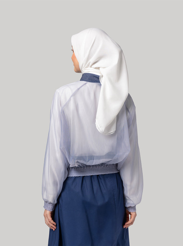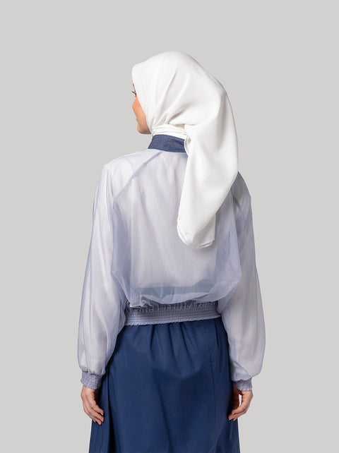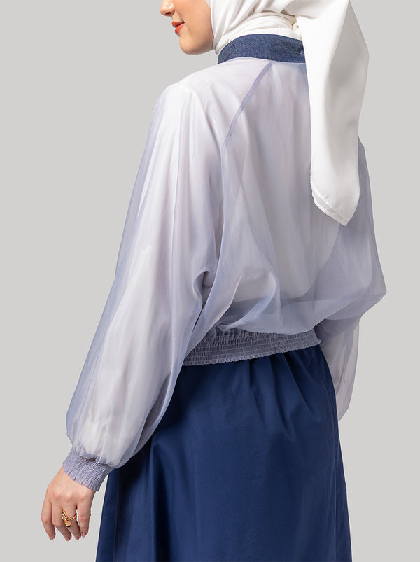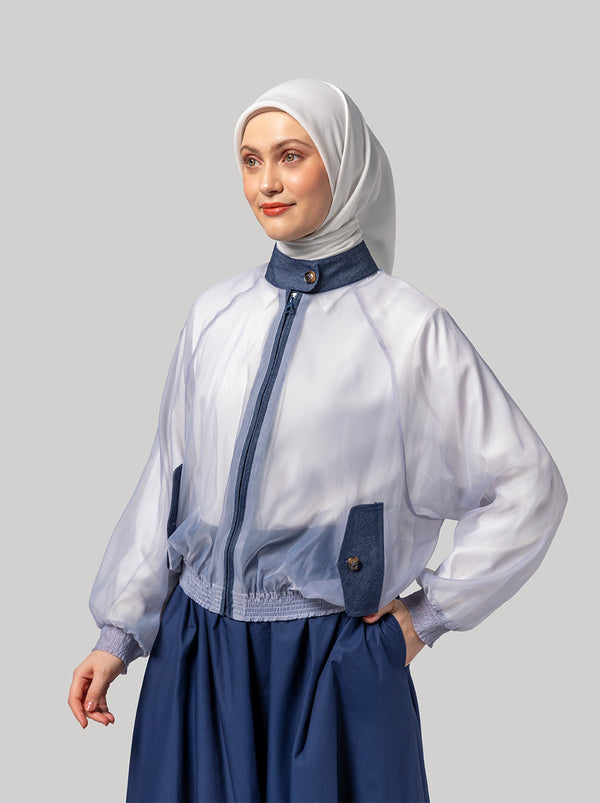 Milla outer will put a unique twist over any look. The sheer, puffy organza, accented with contrasting jeans details. Featuring zipper opening  with elastic cuff and waist.