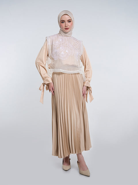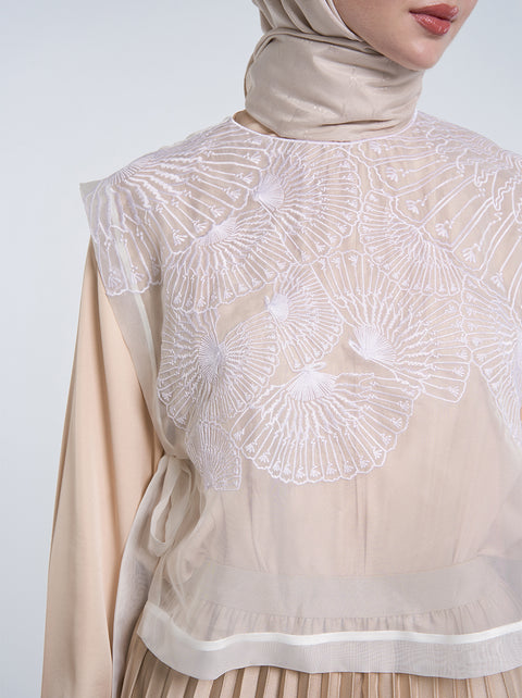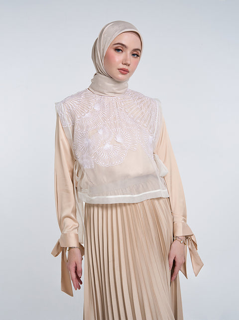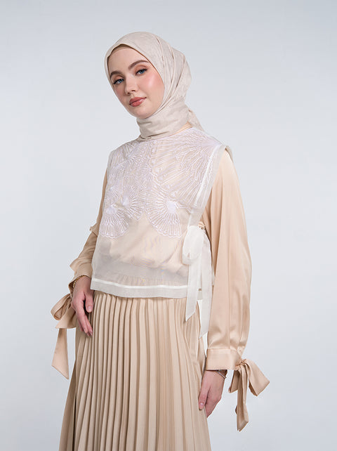 Outer bermodelkan bib ini terbuat dari organza dengan tepi yang dijahit rapi dan menampilkan ikon kipas tradisional mewah dari Nuansa di bagian depan. Lyan Outer dilengkapi dengan pita yang dapat disesuaikan di bawah lengan, untuk styling sesuai keinginanmu.