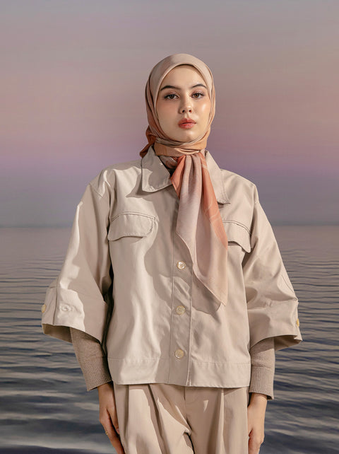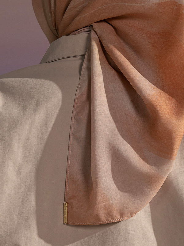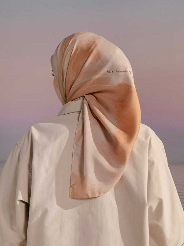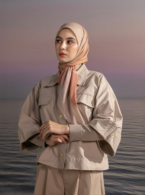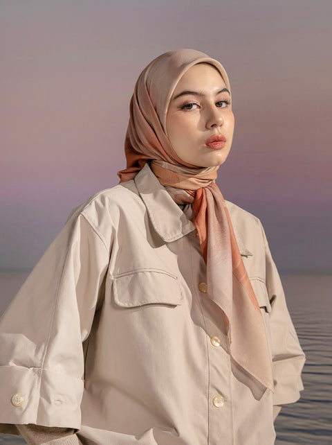 Motif abstrak Reverie scarf menampilkan ilusi mimpi siang hari yang menyenangkan dengan palet warna tropis: cerah, berani, hangat dan menyegarkan. Terbuat dari bahan airy voile yang ringan dengan "pesan tersembunyi"