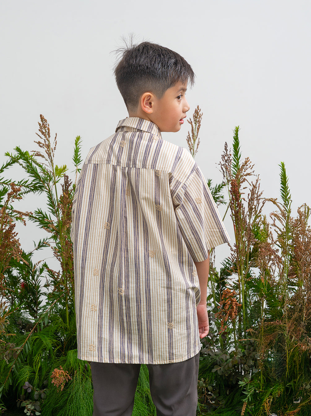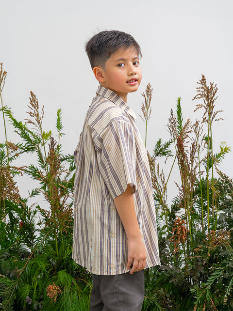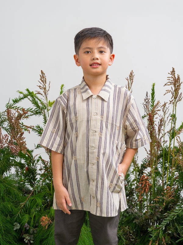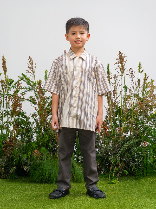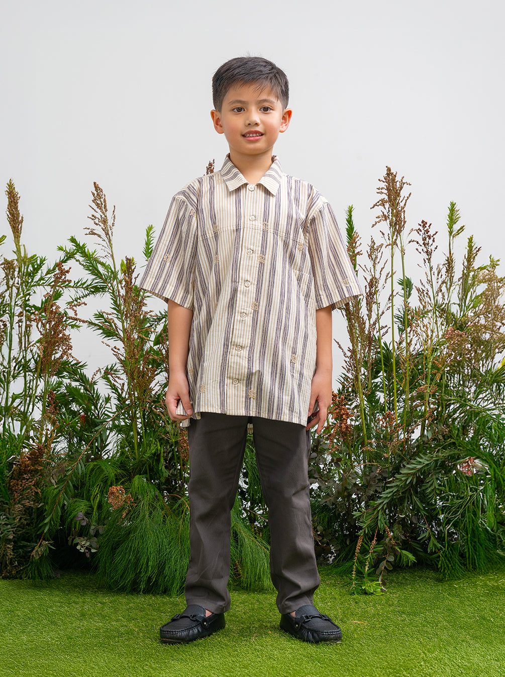 Ammar Koko dengan kombinasi stripes dan bordir Kami yang unik, cocok untuk gaya Raya yang lebih santai. Bahan kantun memberi kenyamanan, dan model saku ganda di sisi memberi detail playful.