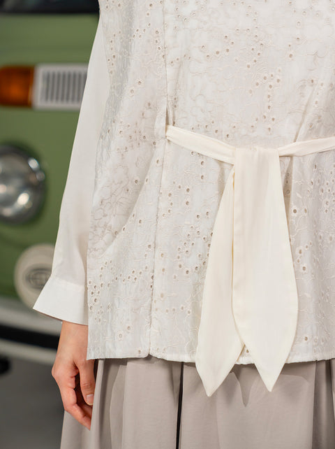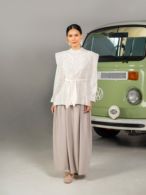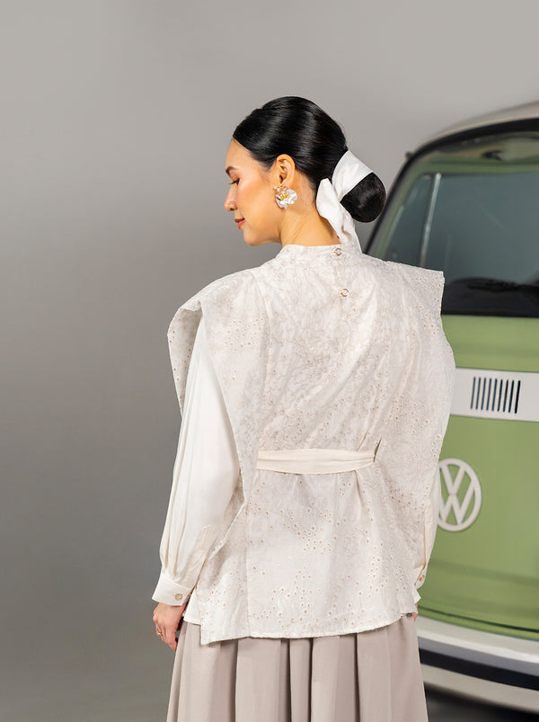 Atasan unik untuk Raya yang memadukan katun eyelet dengan struktur yang tegas. Dilengkapi belt sebagai opsi styling, dalam warna ivory klasik yang mudah dipadu-padankan.