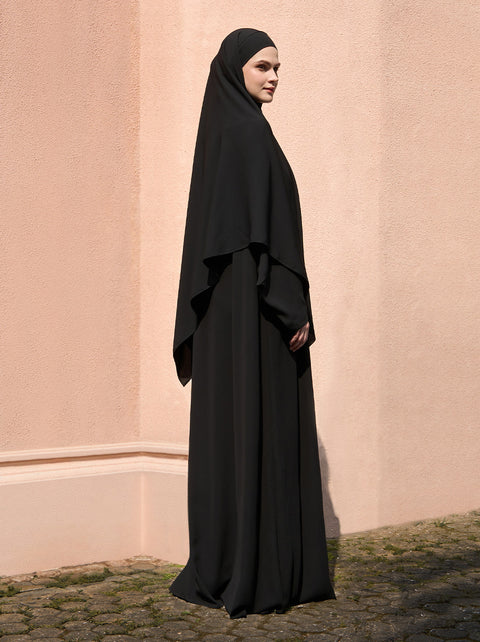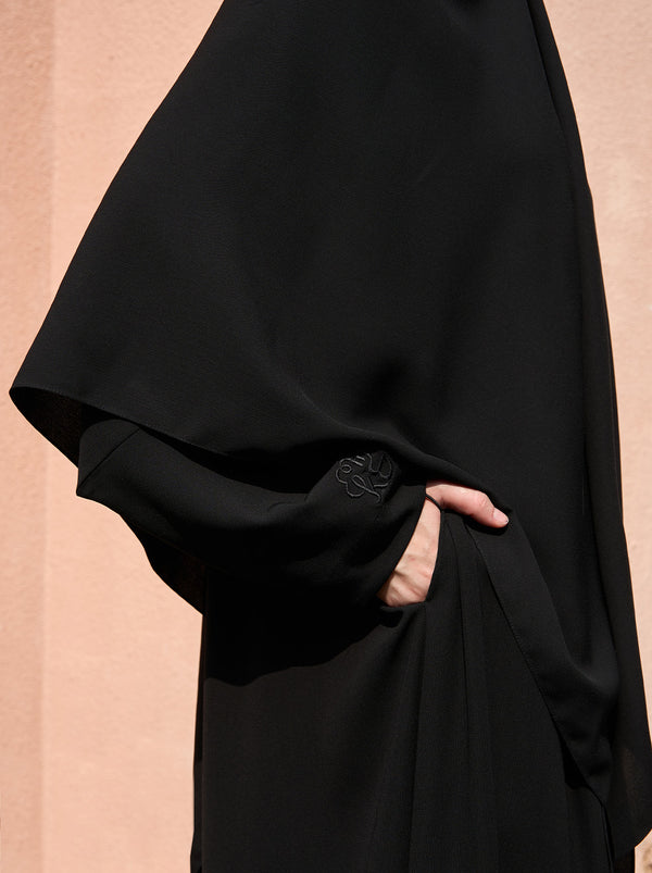 A plain abaya made to accompany your spiritual hajj journey to daily activities with iron-less, airy material. The clean design features thumb loops, side pockets and Kami embroidery.