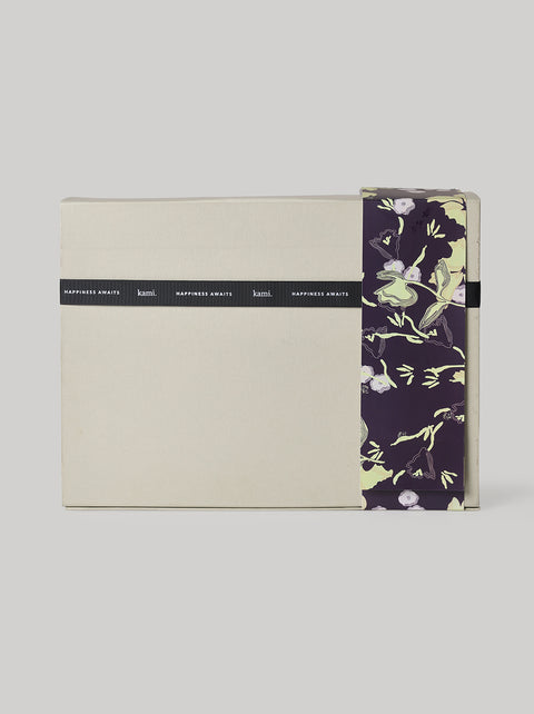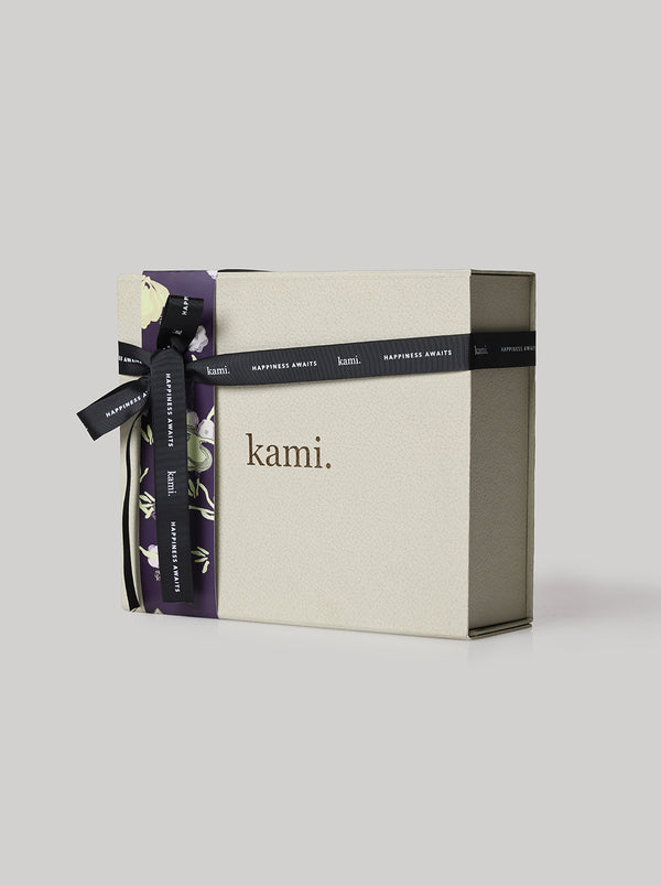 Kami Raya Hampers Box is made for an exclusive unboxing experience. Comes with Tarini pattern sleeve, slim ribbon and Kami branding, perfect to fit Kami prayer set to apparel with sleek and durable design.