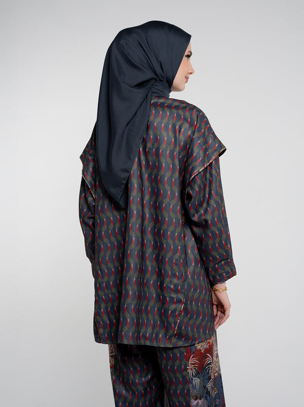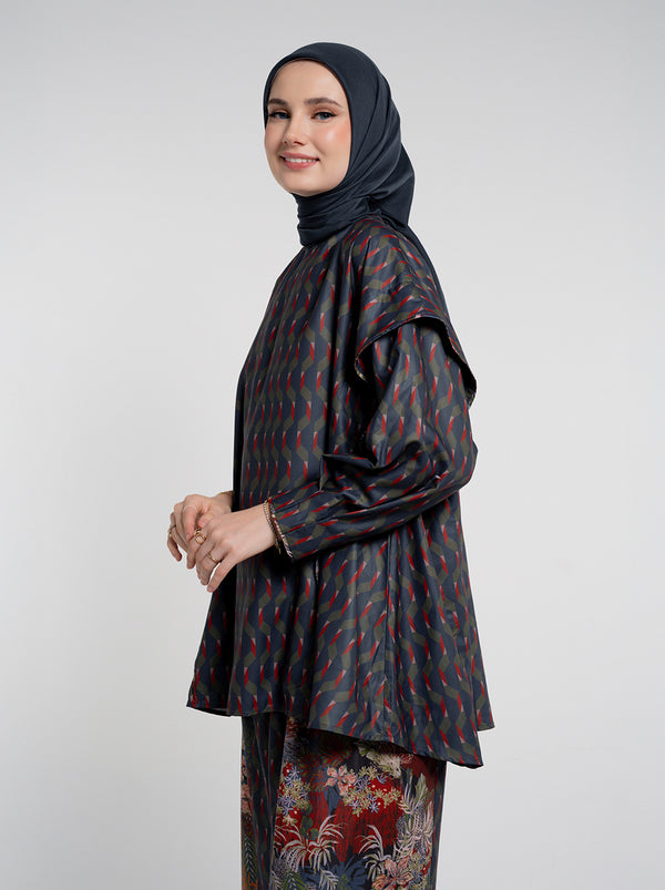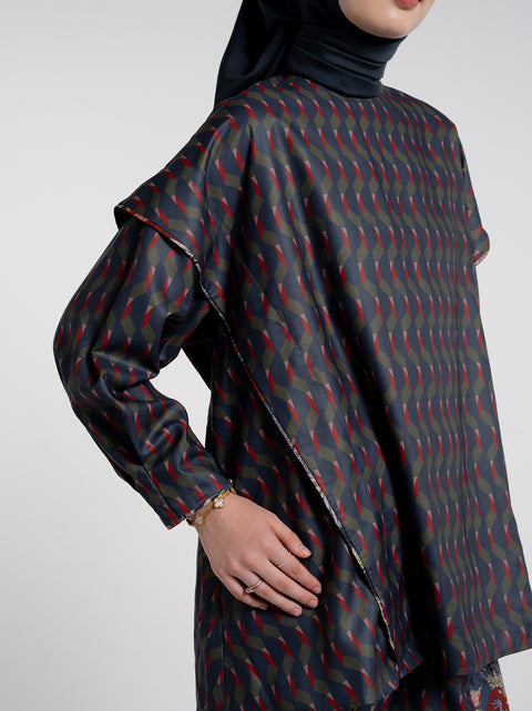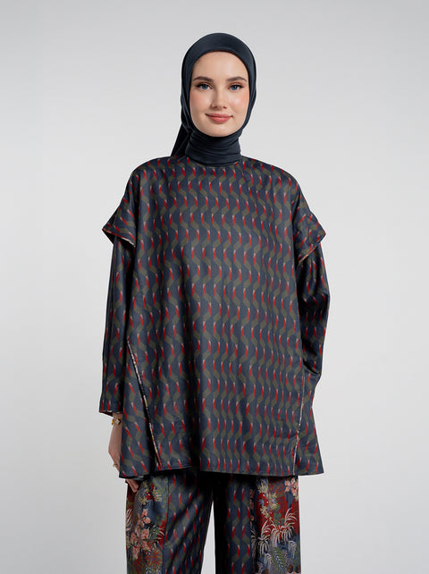Cetta Top menampilkan siluet oversized dengan desain bahu jatuh, menampilkan ciri khas potongan Kami pada aksen depan dan belakang.