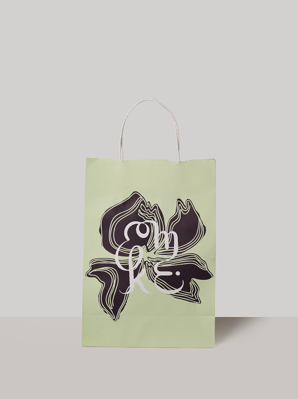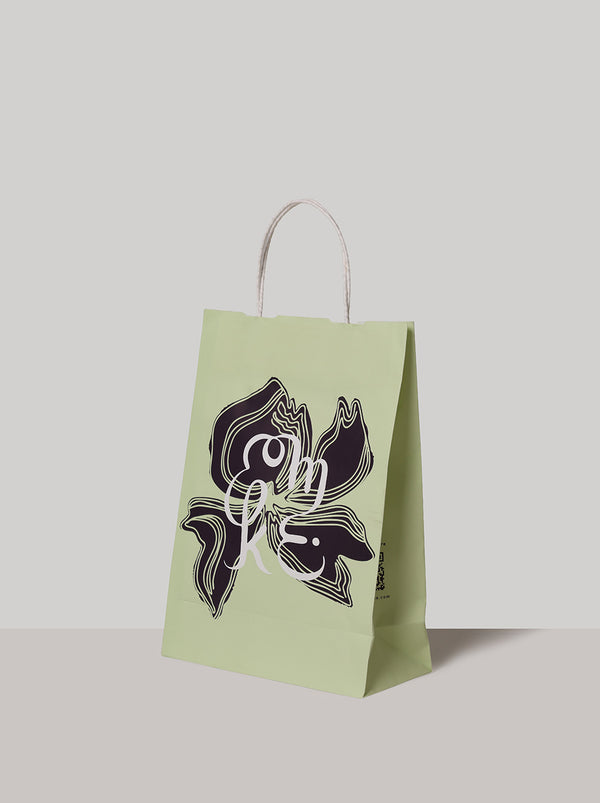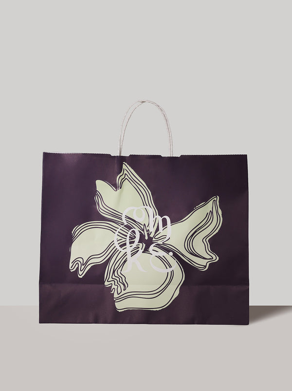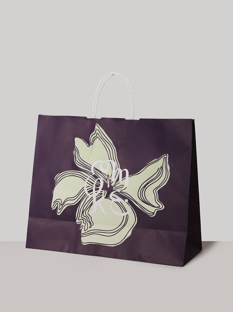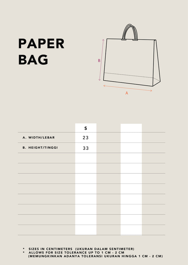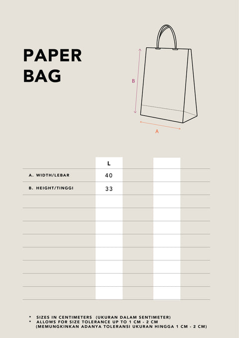 Tas besar yang terbuat dari kertas, dengan pegangan yang terbuat dari kertas berwarna hitam yang di ulin
